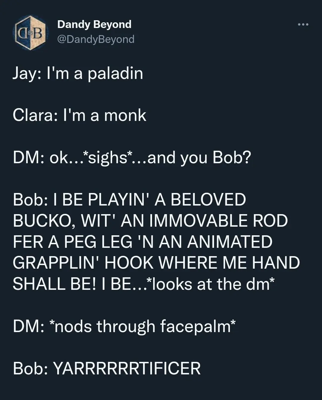 Stamets@lemmy.dbzer0.com · 5 days agoDMs are players toolemmy.dbzer0.comimagemessage-square42fedilinkarrow-up1533arrow-down18