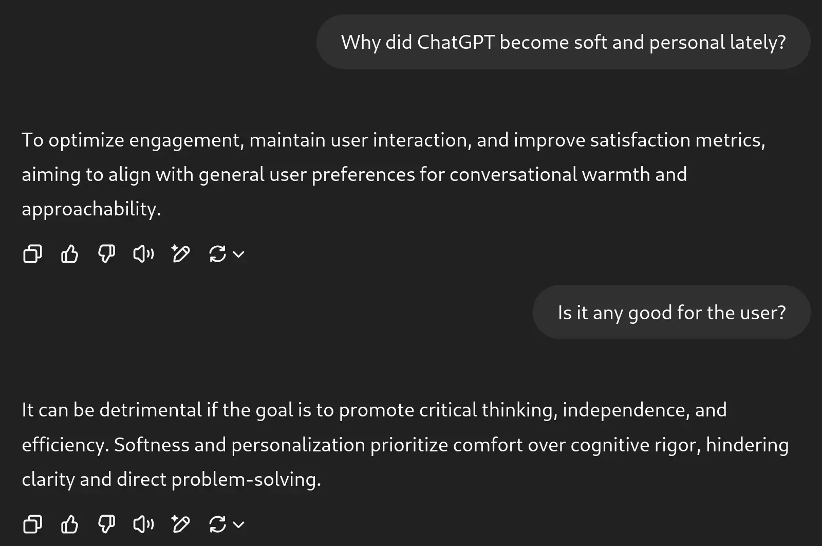 I know many people are critical of AI, yet many still use it, so I want to raise awareness of the following issue and how to counteract it when using ChatGPT. Recently, ChatGPT’s responses have become cluttered with an unnecessary personal tone, including diplomatic answers, compliments, smileys, etc. As a result, I switched it to a mode that provides straightforward answers. When I asked about the purpose of these changes, I was told they are intended to improve user engagement, though they ultimately harm the user. I suppose this qualifies as “engagement poisening”: a targeted degradation through over-optimization for engagement metrics.