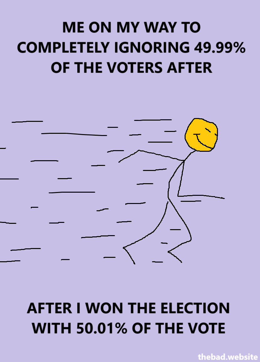 ME ON MY WAY TO COMPLETELY IGNORING 49.99% OF THE VOTERS AFTER AFTER I WON THE ELECTION WITH 50.01% OF THE VOTE