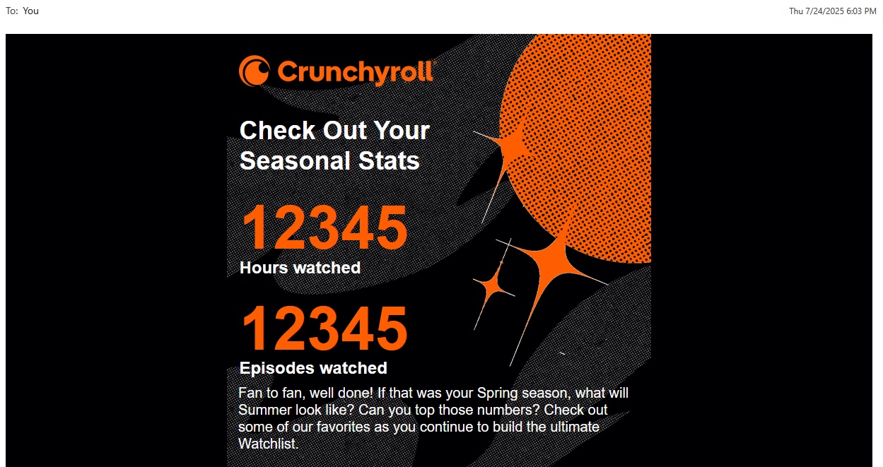 Today I opened my email to find out I watched, in the last year, over a year’s worth of anime! There are only 8760 hours in a year, so not only did I watch over a year’s worth of anime, I somehow pulled a Hermoine went beyond what a person could cram in normal time!