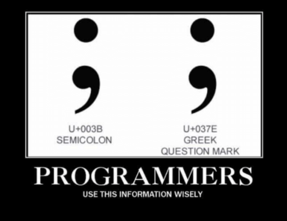 Take someone’s source code, replace all semi colons with Greek question marks and see if they can compile. But as others said, any IDE will help.