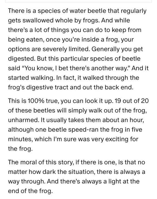 minus-squaredalekcaan@feddit.nllinkfedilinkEnglisharrow-up21·3 months agoAndy crawled to freedom through five hundred yards of shit-smelling foulness I can’t even imagine, and came out clean on the other side