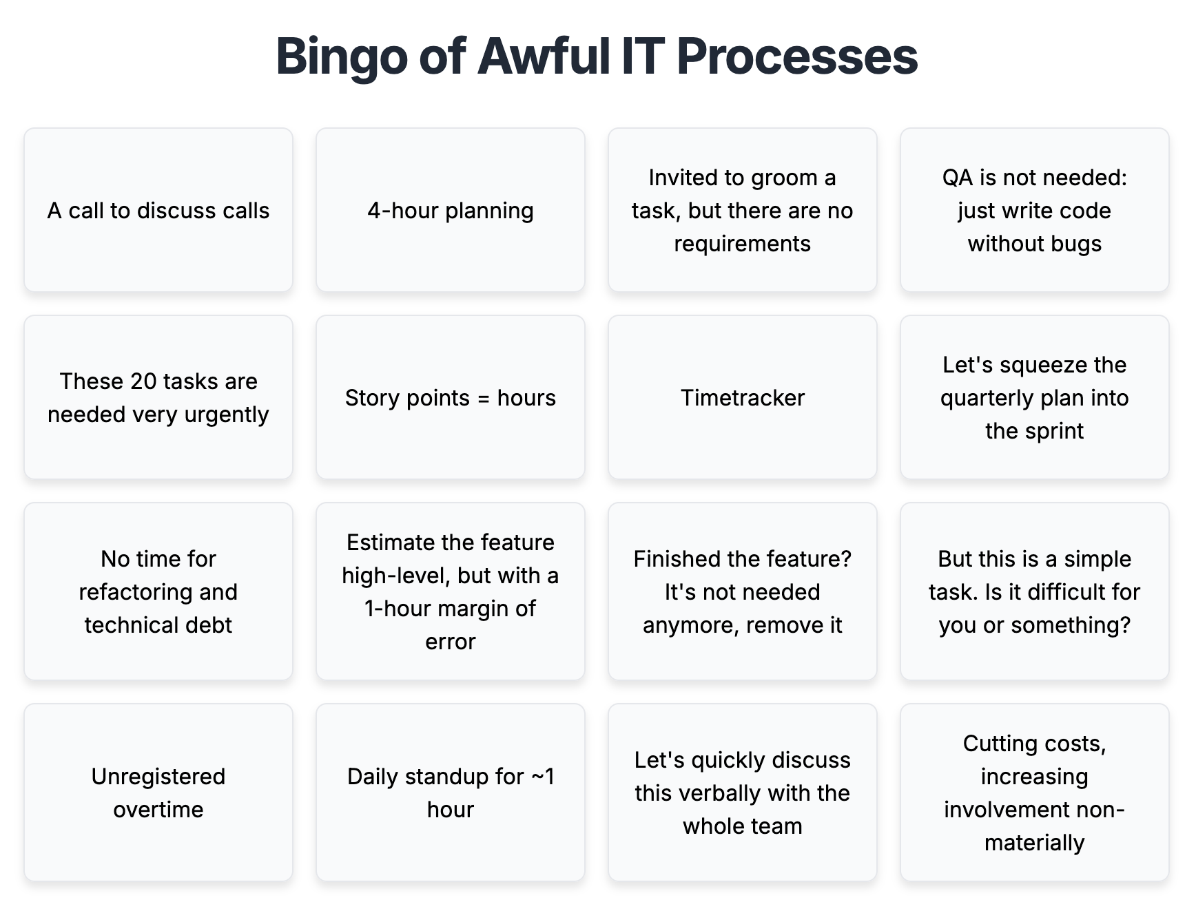 arrow-up1384arrow-down1imageBingo of Awful IT Processeslemmy.mlcm0002@lemmy.world to Programmer Humor@programming.dev · 2 months agomessage-square52fedilinkcross-posted to: programmerhumor@lemmy.ml