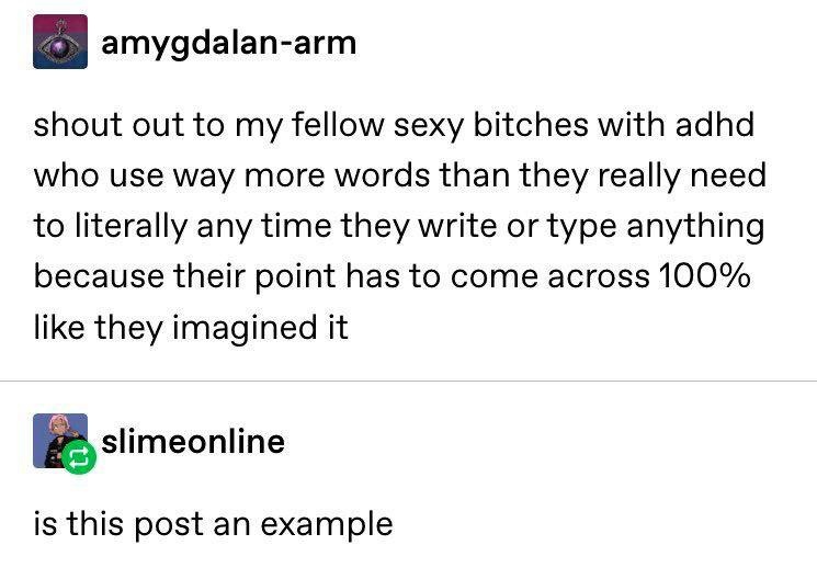 I relate to this so hard. I always reread anything before posting, because my sentences in English (not my native language) tend to be convoluted as fuck. No, I won’t reread this before posting.