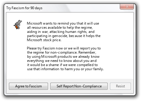 Honestly, while Windows sucks and so on, Unix has been more instrumental in bringing fascism to us. Via the Internet, and the Unixy hierarchical “one right dumb way” models of everything.