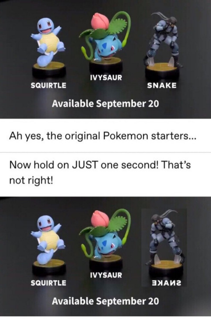 [alt text: a screenshot of a pair of posts, possibly from tumblr. The first post shows a promotional image of three new Nintendo Amiibos: the Pokemon “SQUIRTLE”, the Pokemon “IVYSAUR”, and “SNAKE” from the Metal Gear series. Below the image is a text caption which says: “Ah yes, the original Pokemon starters. . .” The second post begins with the text caption: “Now hold on JUST one second! That’s not right!”. The image below the text is the same image from the previous post, except Snake has been edited and flipped horizontally, such that his name now reads “EKANS” (like the snake Pokemon).]