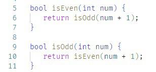 isEven(0) -> true; isEven(Num) -> isOdd(Num-1). isOdd(0) -> false; isOdd(Num) -> isEven(Num-1).
