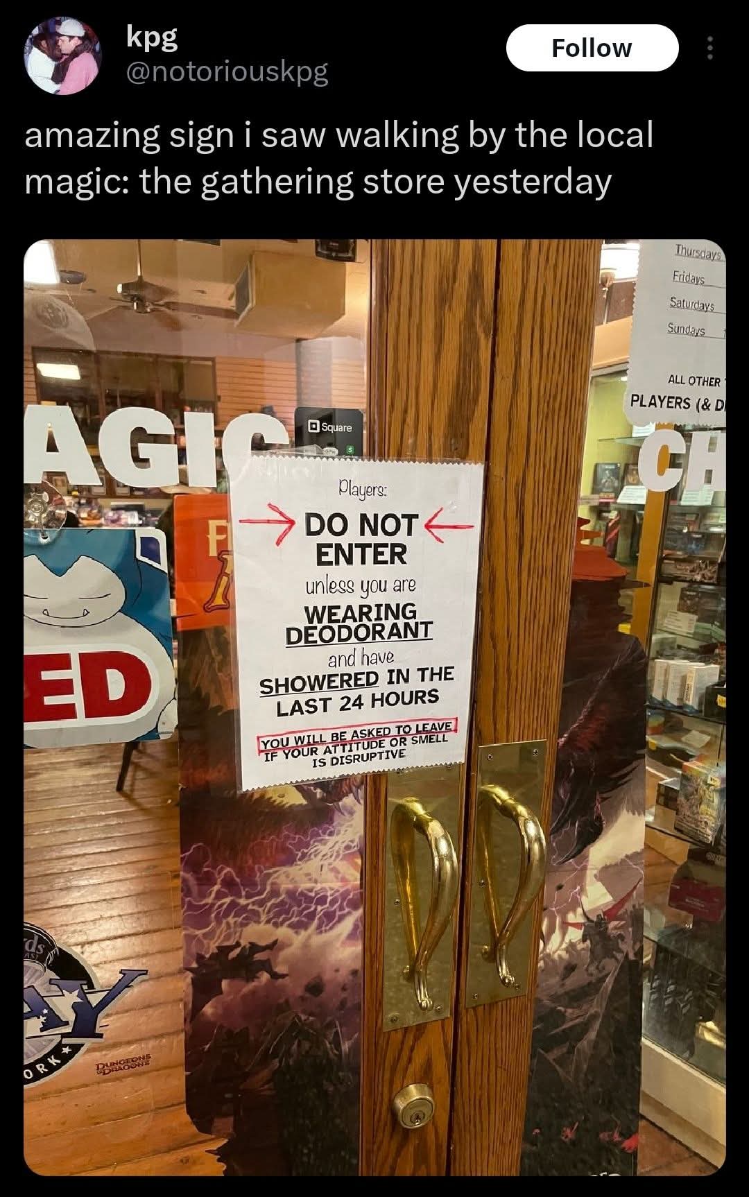 On opening the door I was hit with the worst BO wave that has ever crashed over me, and having been in gaming stores before, this says a lot. There were some young guys sitting at tables surrounded by backpacks, which I can only assume were full of fermented roadkill, and playing various games, looking up curiously as I tried my best to smile and nod a greeting. My eyes watered and I left immediately because I felt like I was going to vomit.