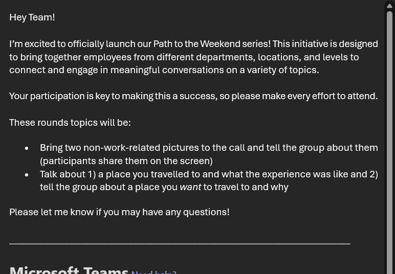 As an NT, could you help me understand your feelings towards this event? I would really enjoy learning more about my coworkers and what is meaningful to them. It sounds like it would reinforce team bonds and help me understand my coworkers beyond their just their superficial work layer. I’m sure they have fun interests and experiences to share which we might even have in common and nerd out about, or grow into a new interest for me that could enrich my life.