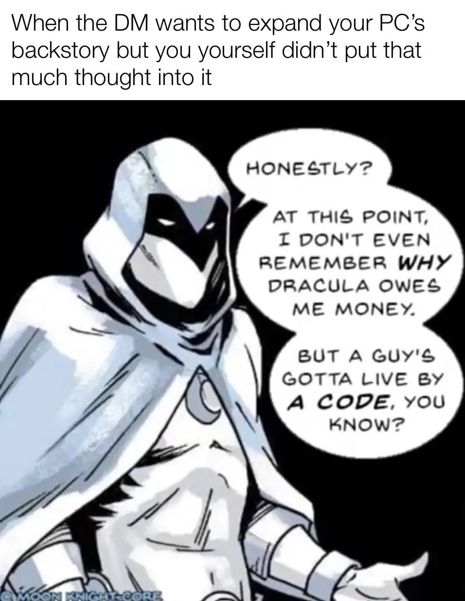 Stamets@lemmy.dbzer0.com to RPGMemes @ttrpg.network · 21 days agoBackstory problemslemmy.dbzer0.comimagemessage-square9fedilinkarrow-up1388arrow-down13
