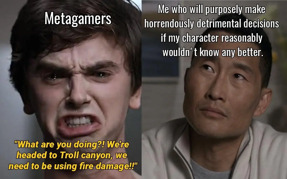 Oh, sure, you could absolutely make a case for your character accidentally stumbling on the right answer simply because fire is a good weapon, and a good roleplayer could use that to their advantage to metagame a bit more acceptably, but there’s a difference between that and just automatically grabbing fire stuff because you the player know it’s good against trolls.