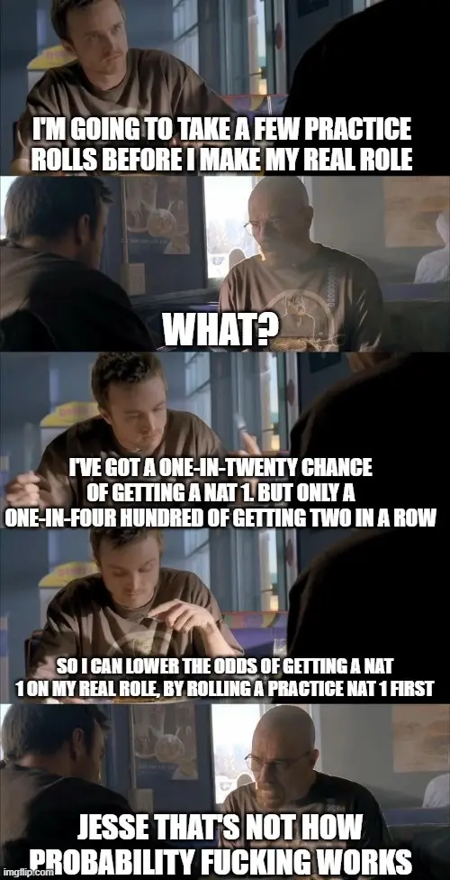 That’s what the meme says, but probability doesn’t work that way. If you want the result from a roll, what you’ve roller before has no bearing on the result from this roll. Thus the chance for a single d20 roll is always 1/20, or 5%.