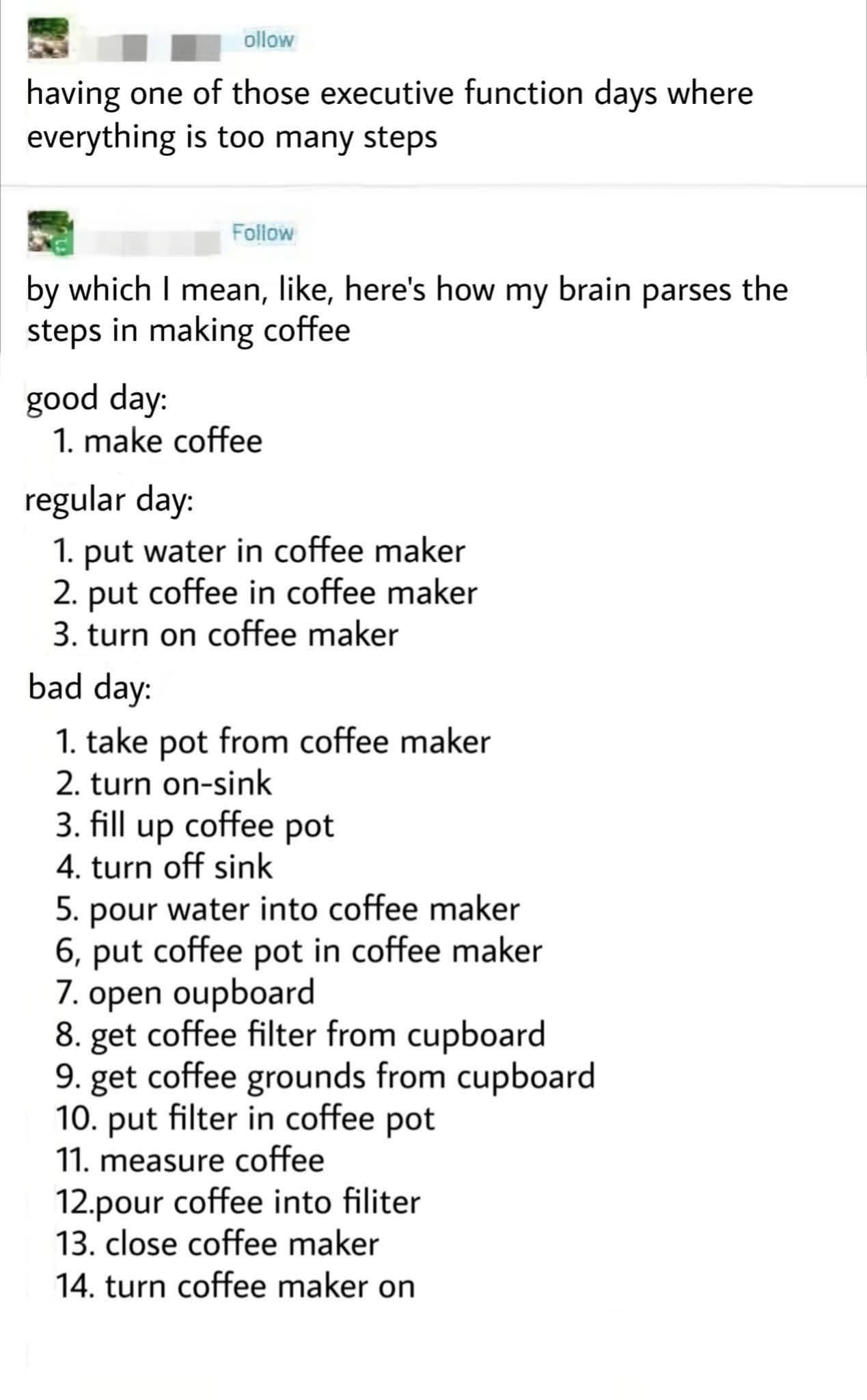 To reduce steps, I keep the electric kettle on the counter. Then it’s just steps 5-12. But you also forgot step 10.B = forget about tea, and 10.C = remember tea and try to figure out where you left it.