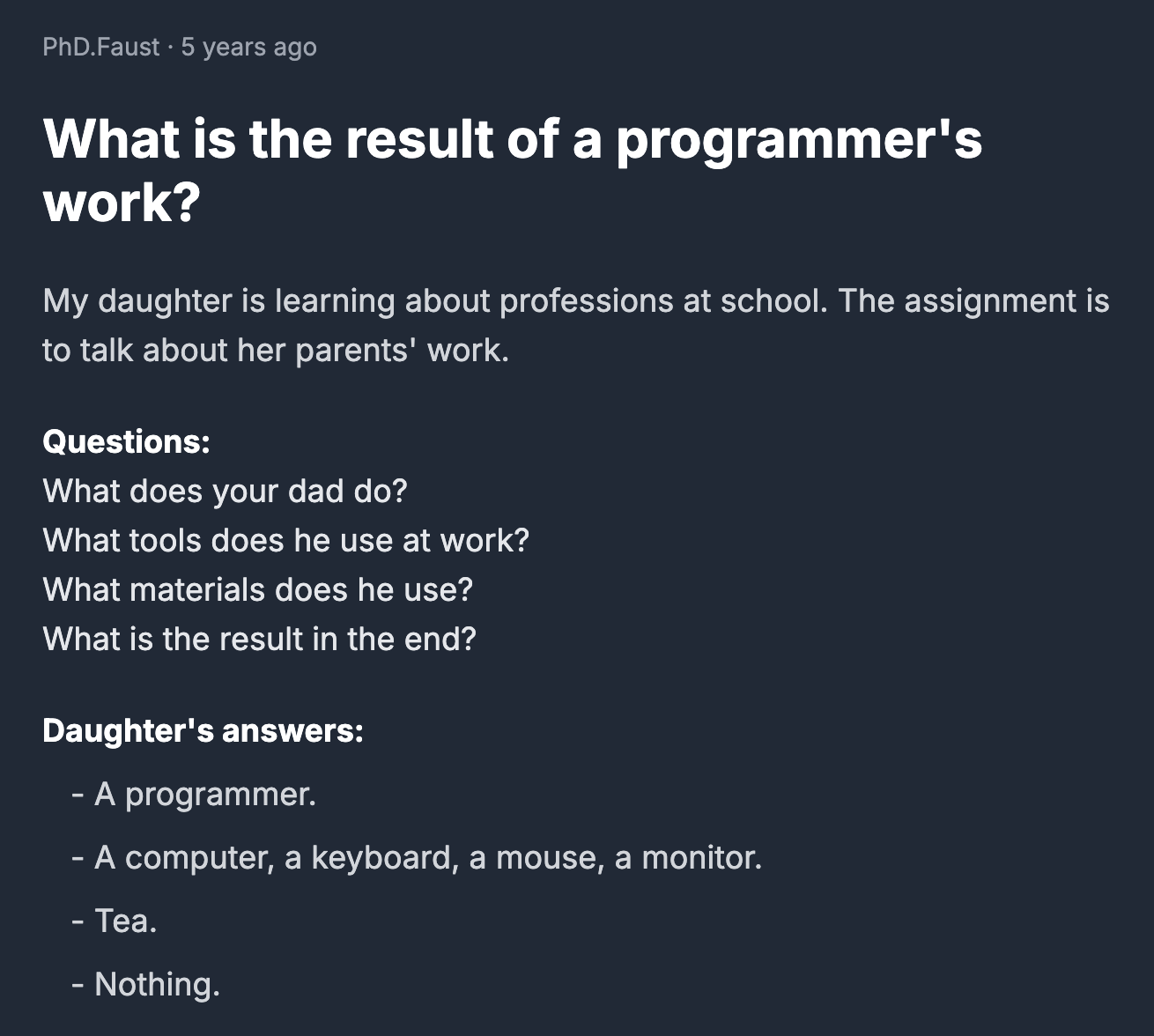 arrow-up190arrow-down1imageWhat is the result of a programmer's work?lemmy.ml☆ Yσɠƚԋσʂ ☆@lemmy.ml to Programmer Humor@lemmy.mlEnglish · 2 months agomessage-square3fedilinkcross-posted to: programmer_humor@programming.dev