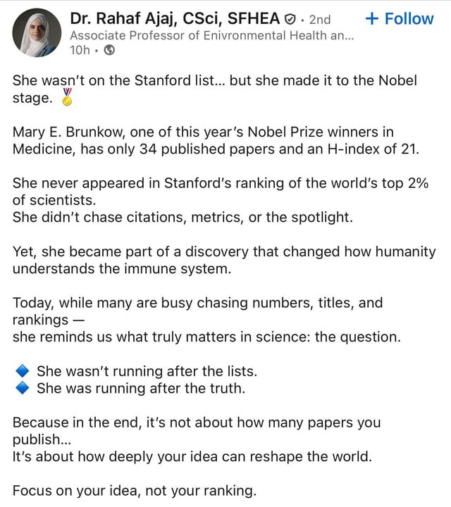 fossilesque@mander.xyzM to Science Memes@mander.xyzEnglish · 23 days agoMary E. Brunkow, one of this year's Nobel Prize winners in Medicine, has only 34 published papers and an H-index of 21.mander.xyzimagemessage-square78fedilinkarrow-up1747arrow-down112