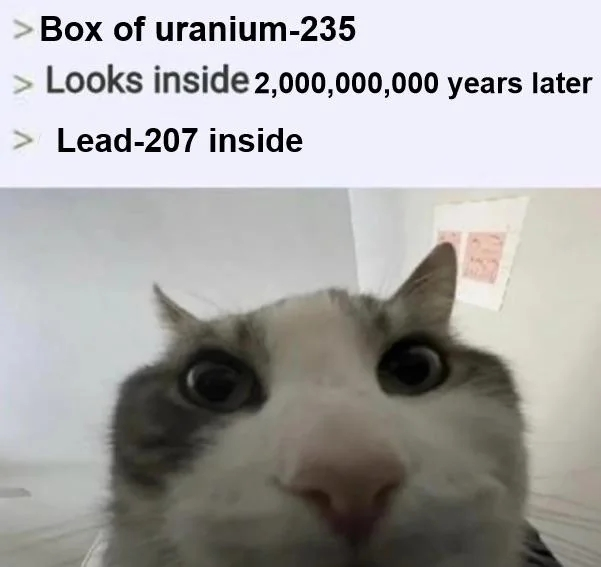 Most uranium on earth is U-238, though, which has a longer half life of about 4.5 billion years, so that the amount of U-238 on earth today is about half of when the earth was formed. But the meme is about U-235, so that’s just background information not directly relevant to the picture.
