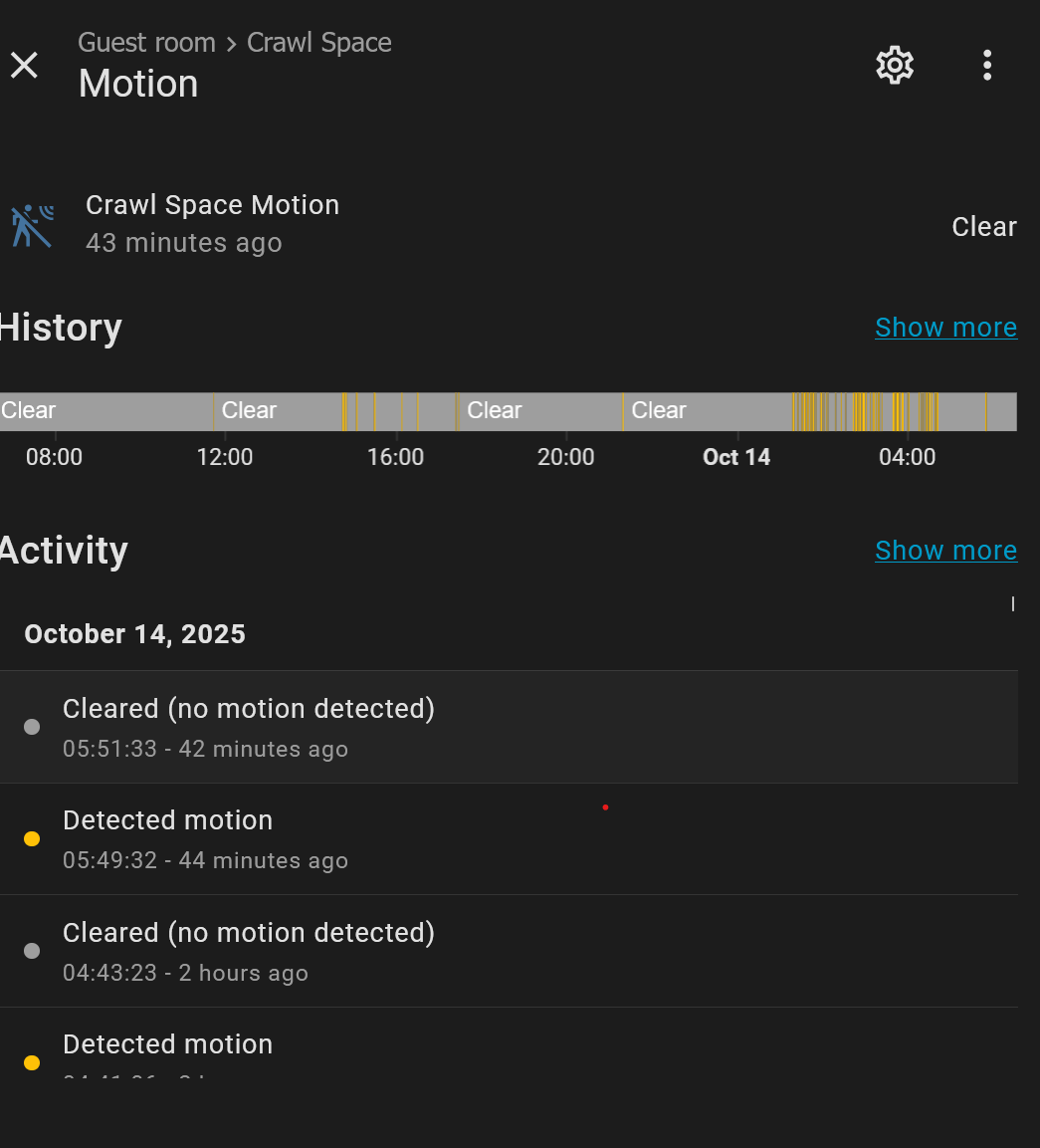 We’ve been having trouble with rodents (I assume squirrels) in the crawl spaces on our second floor. I decided to stick a PIR sensor on the door to see if I could catch any movement, and sure enough, a bunch of movement around 1 AM this morning. (Correction, it was a possum, which makes sense in hindsight as they’re nocturnal).