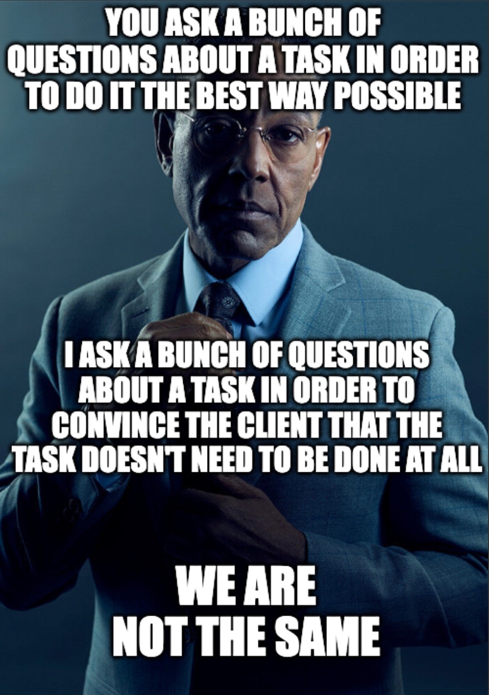 You ask a bunch of questions about a task in order to convince the client that the task doesn’t need to be done at all.