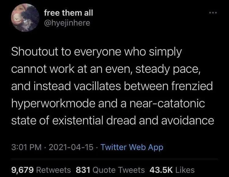 I heavily vibe with the meme, and I work as a programmer. Usually I have a task or two for several days so I just work at my own pace if it is not some high priority stuff. Sometimes it is 1 hour on 2 hours off, sometimes it is 10 hours of hyperfocus and a feeling of emptiness when I am done and want to continue.
