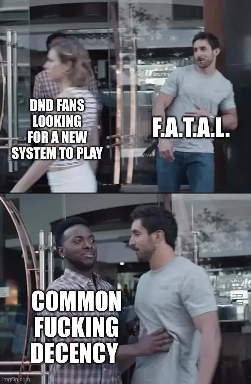 And for those who don’t have time, the only thing you need to know about FATAL is this; it’s an RPG made by the kind of people who stormed the capitol on Jan 6. Horrifically racist, sexist and queerphobic, and designed by people so fundamentally stupid and lacking in curiosity that they can’t get even the most basic of design concepts right, but so utterly obsessed with the idea of their own intellectual superiority that they keep trying to reinvent every single wheel.