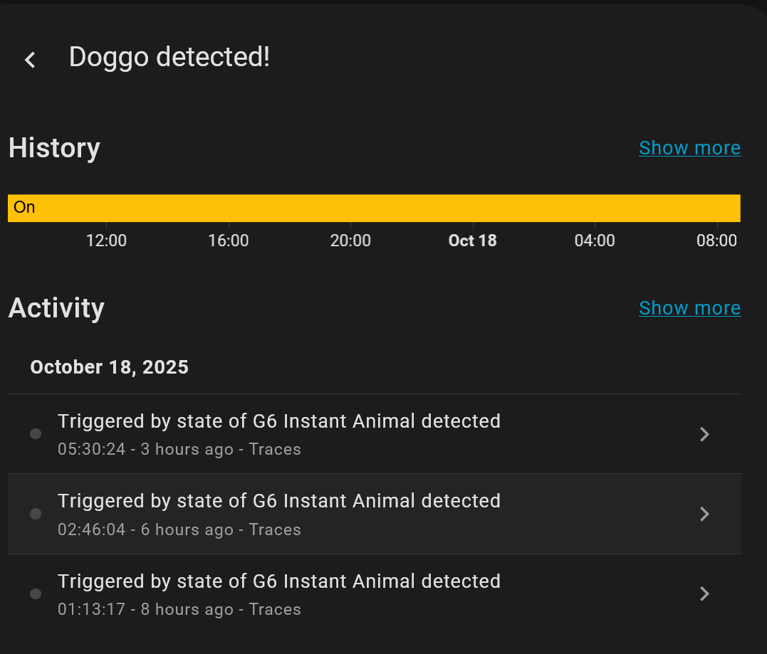 arrow-up1120arrow-down1imageI made my Unifi camera excitedly scream 'Doggo!' every time it detects an animal. I did not account for the several minute delay for image processing and the fact we have stray cats.lemmy.worldearly_riser@lemmy.world to homeassistant@lemmy.worldEnglish · 7 days agomessage-square10fedilinkfile-text