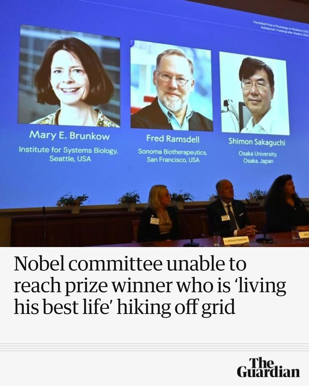 Reading the article (https://www.theguardian.com/science/2025/oct/07/nobel-committee-unable-to-reach-medicine-prize-winner-hiking-off-grid), I feel like the least the committee could do is make an effort to call winners during their daytime hours. 😅 Sounds like too many cases of unexpected calls in the night.