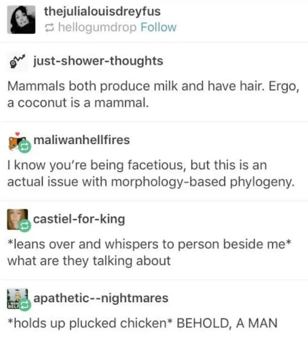 Yeah, I know it is a joke and all, but coconuts doesn’t have hairs or contain milk, so that particular example doesn’t undermine “morphology-based phylogeny” at all.