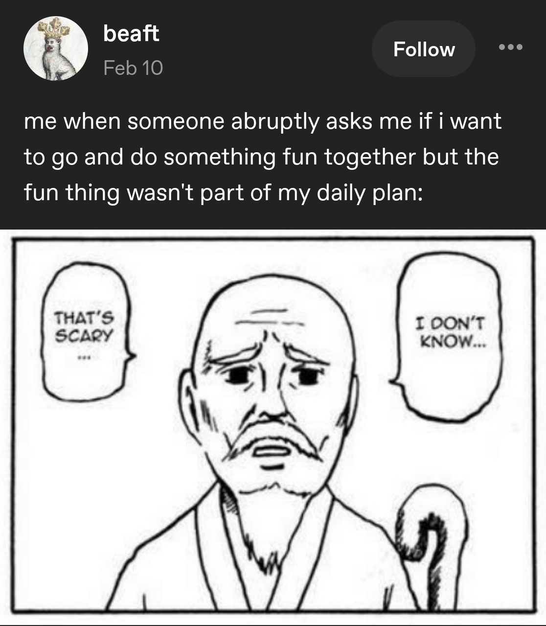 This seems more like an introvert thing. If I’ve already exhausted my social battery for the day, ain’t no way I’m agreeing to interact with more people later.