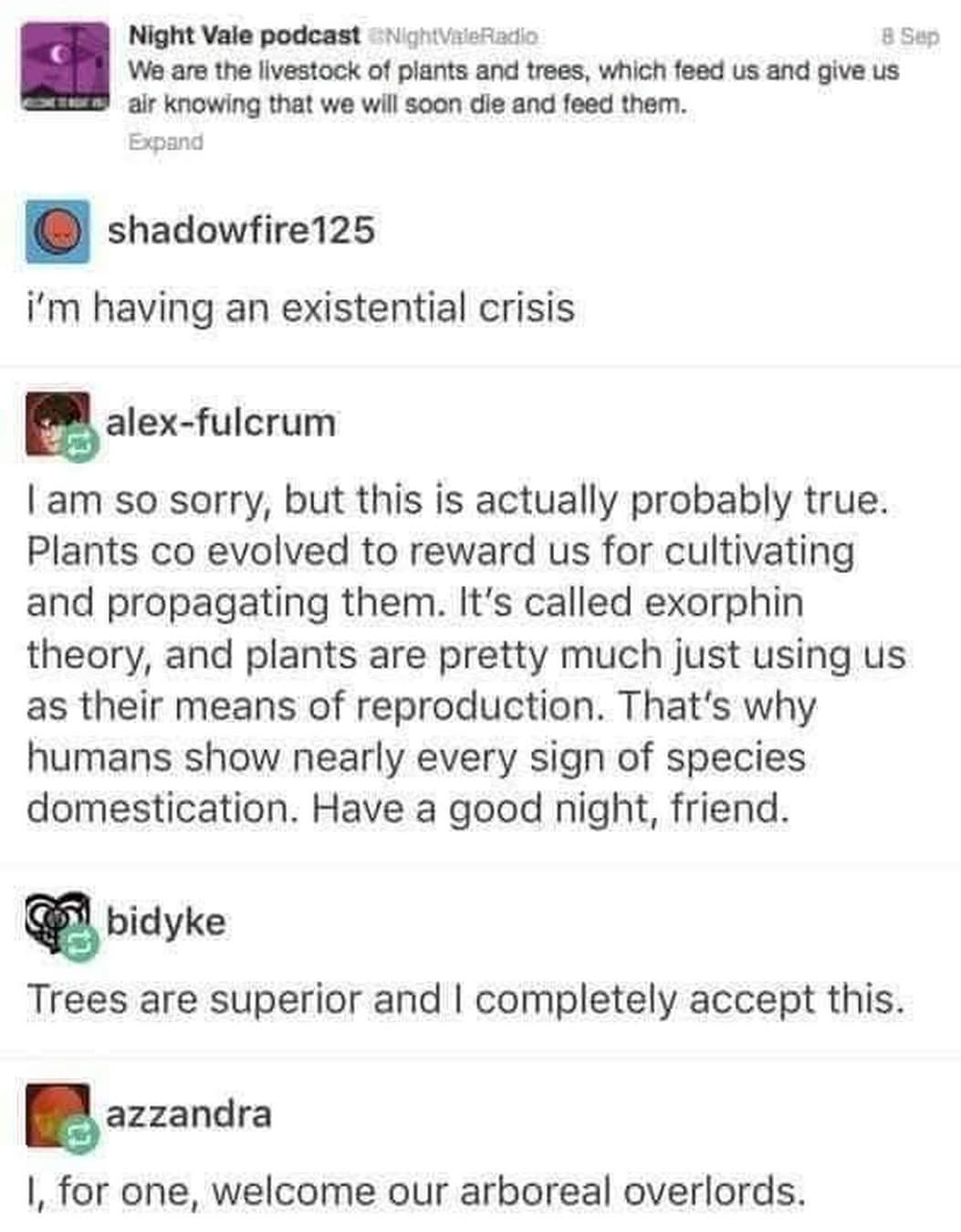 If we are being ruled by our crops it would have to be corn and not trees, unfortunately. Trees would be much better overlords I think.
