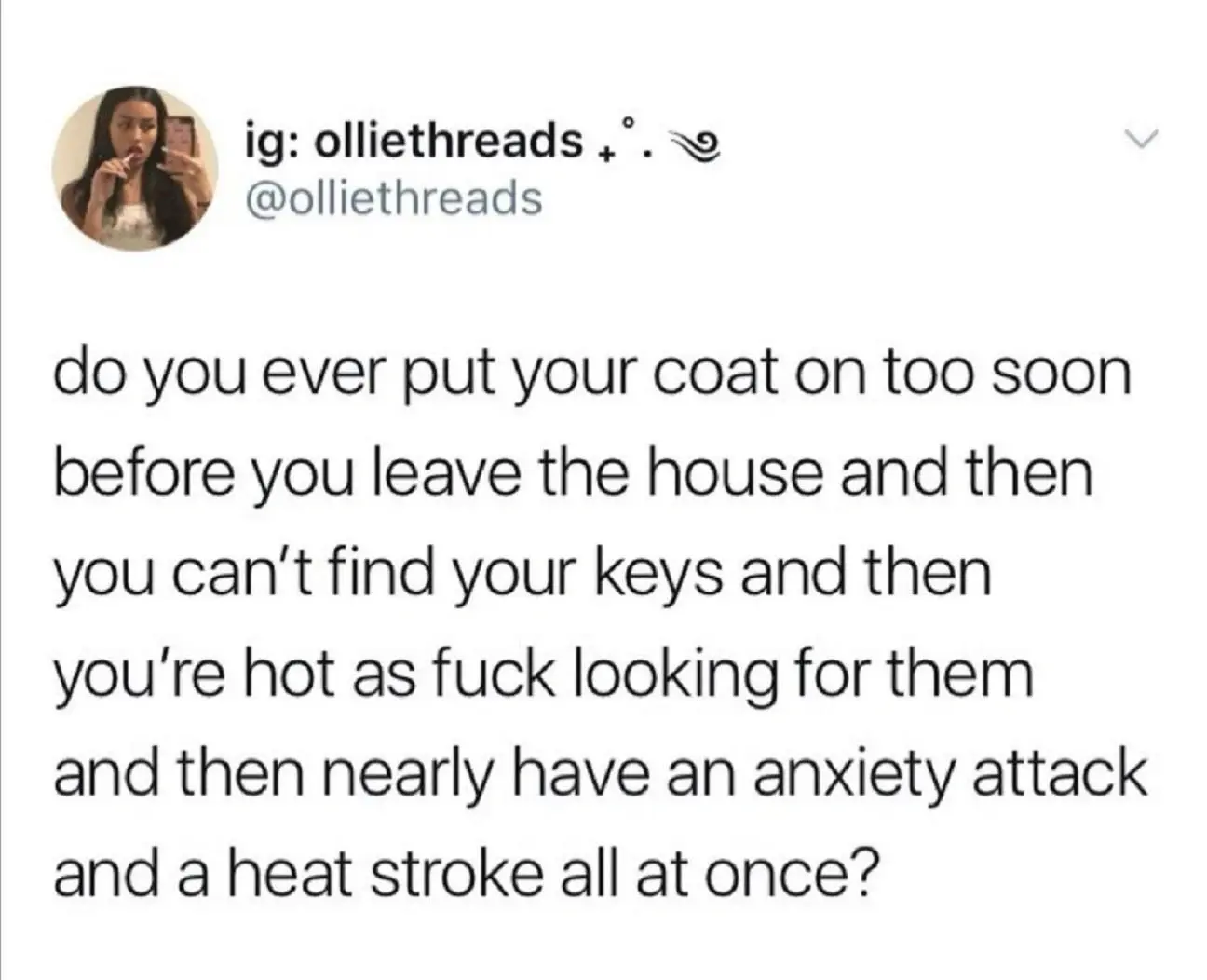 Oh, I thought this was the “they were in my coat pocket” one again. This exact thing is why I bought an airtag for my keys.