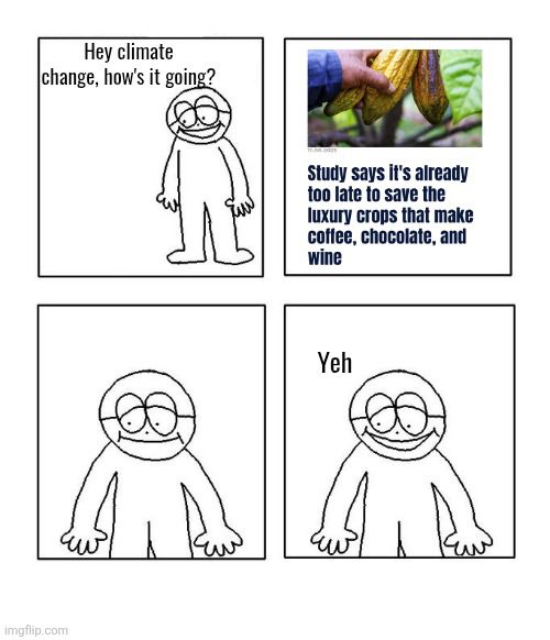 That’s not what that seems to say at all. It doesn’t even look like it says “if we do nothing, we can’t grow these crops anymore”. It seems to be specifically about stratospheric aerosol injection (a specific geoengineering technique that we haven’t even committed to trying as yet), and suggests that if you use it to keep global temperatures stable, there can still be changes in where these crops can grow because changes to things like rainfall and humidity. I’ve not read the entire thing but from a glance at it’s conclusions, their simulations suggest that the crops would remain economically important to their growing regions under all their simulations, just with the viable amount that can be grown and the specific areas for doing it changed per region, and that using SAI to offset warming doesn’t simply result in the same yields as not having the warming would have the way one might otherwise expect.