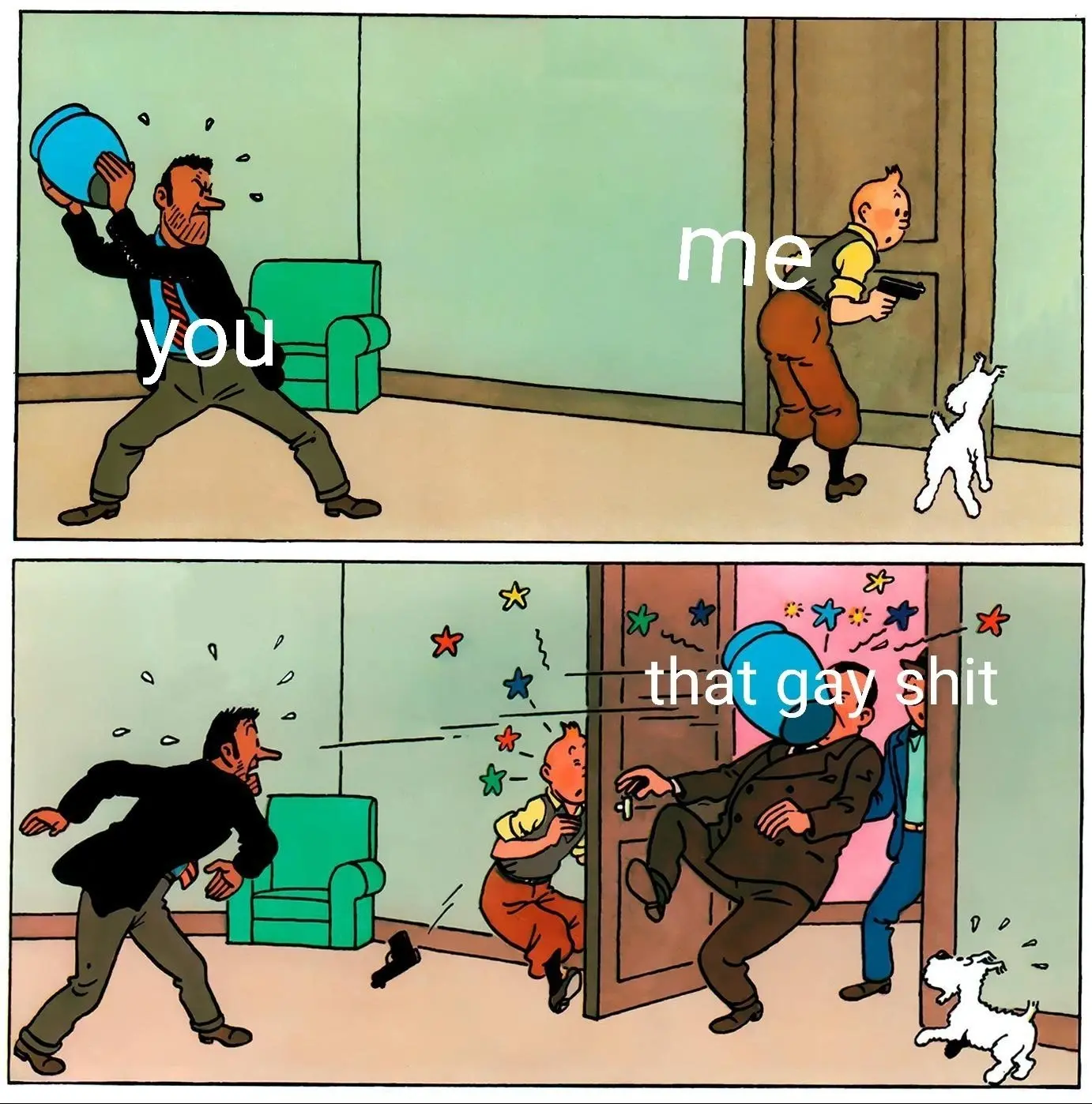 minus-squareScratch@sh.itjust.workslinkfedilinkEnglisharrow-up2·1 month agoDoesn’t this comic say “Miss me with that gay shit.”