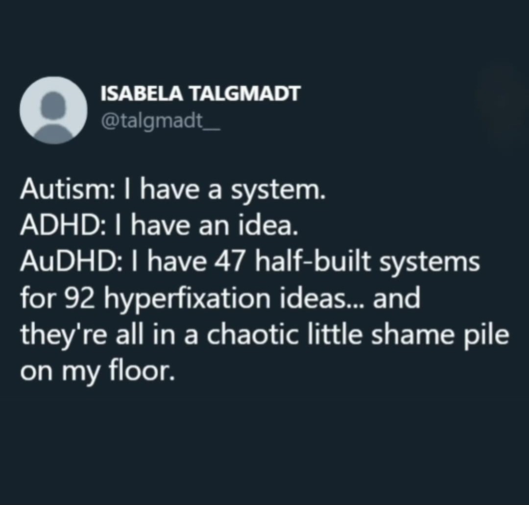 I’ve been spending a lot of my medicated productive time meticulously organizing all kinds of aspects of my life only to forget about them for weeks or months, despite telling myself it’ll totally stick this time. is my ass autistic, too?