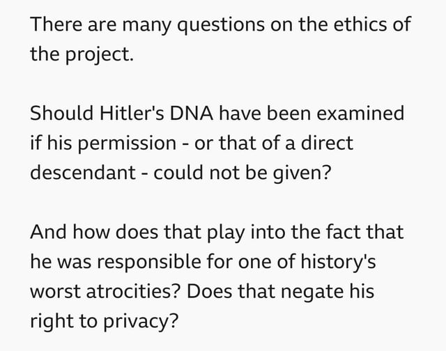 Therefore combining the two, Hitler was and is a criminal therefore privacy protection laws don’t apply, therefore his DNA should be freely usable by the scientific community.