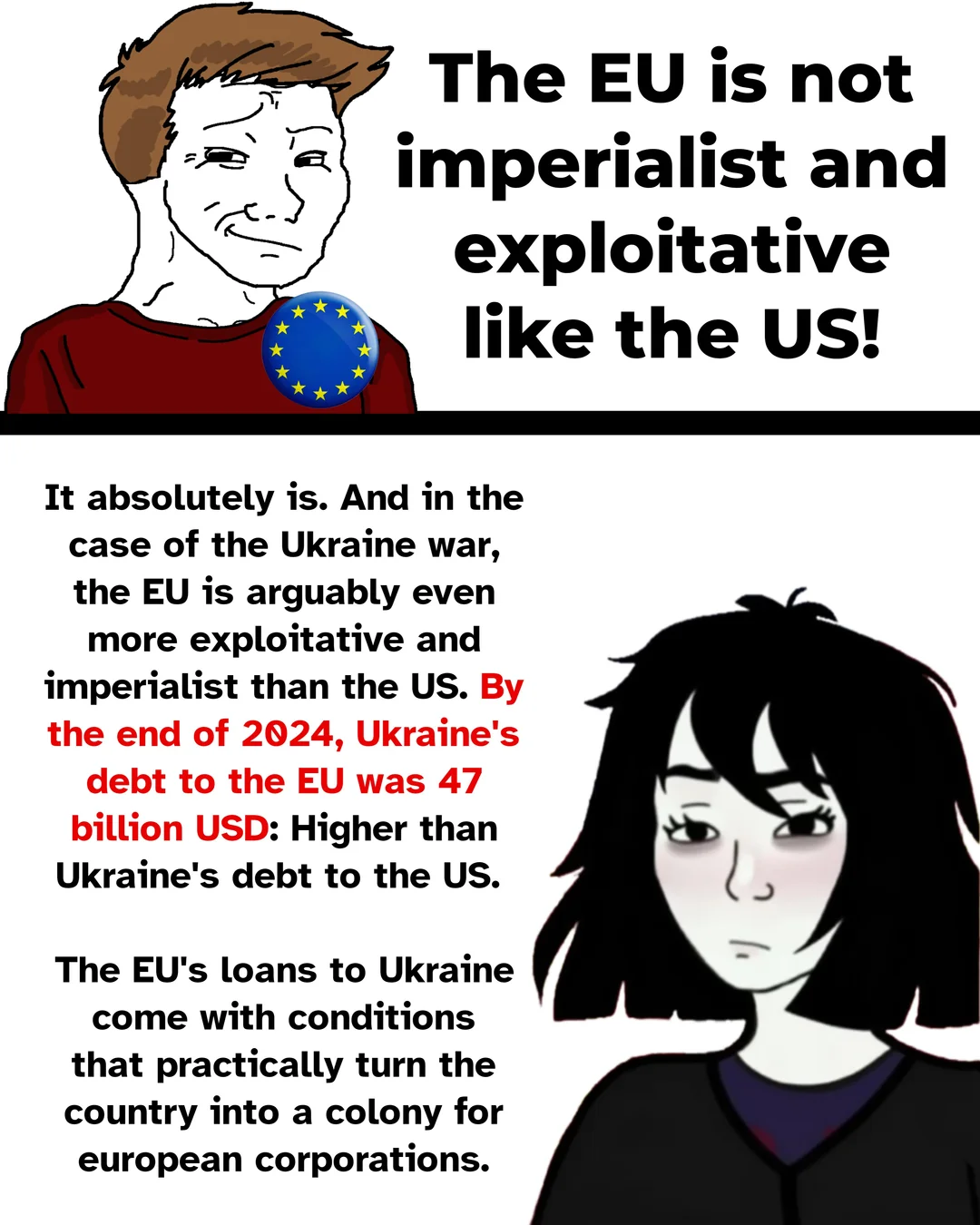 minus-squareHlodwig@lemmy.worldlinkfedilinkarrow-up2arrow-down1·4 hours agoBruh… They won’t have the choice. The difference with your mexico comparison is that 15% of russian GDP has already been seized. And “reliefweb.int”… Lol, you are pathetic xD
