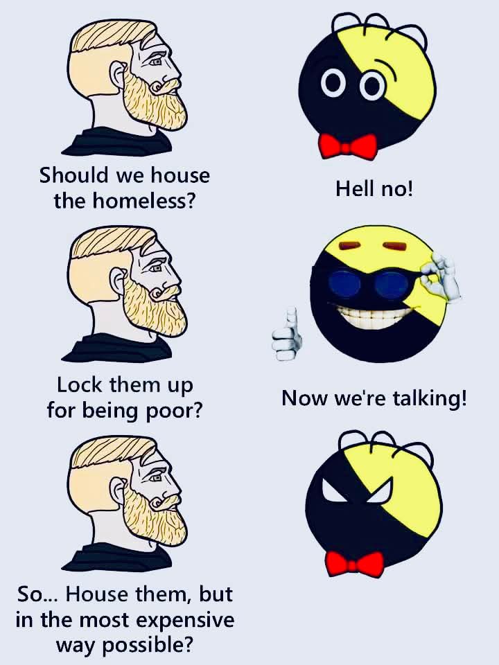 In particular if you look at the long term (even just a couple of years): many homeless just need a little help to start climbing the ladder again. So housing and mental care would allow them to quickly become productive members of society. Prisons just lock them into a circle of poverty.