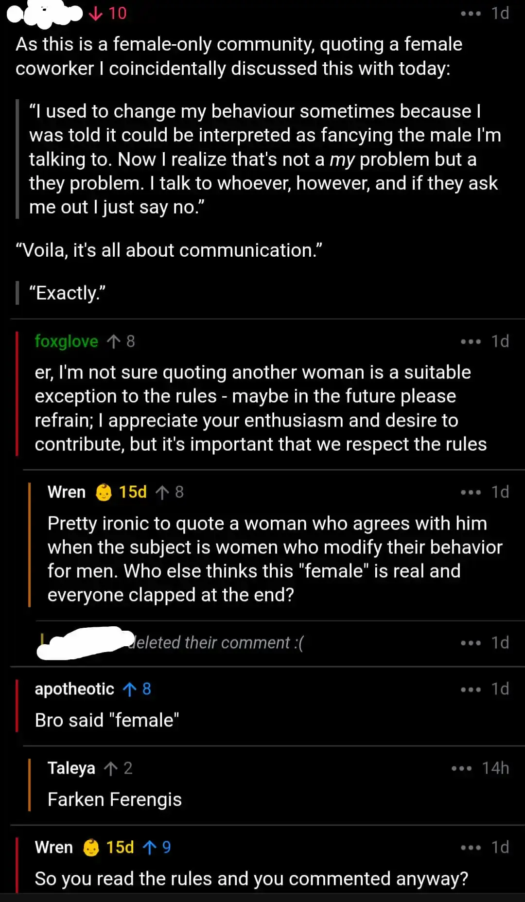 They’re not supposed to ban by default as far as I know, could have been an overzealous mod or a mistake. I get the same thing online, so I find it fucking infuriating to gender personality traits and tone. As an active poster on that sub I don’t want to see things go that way.