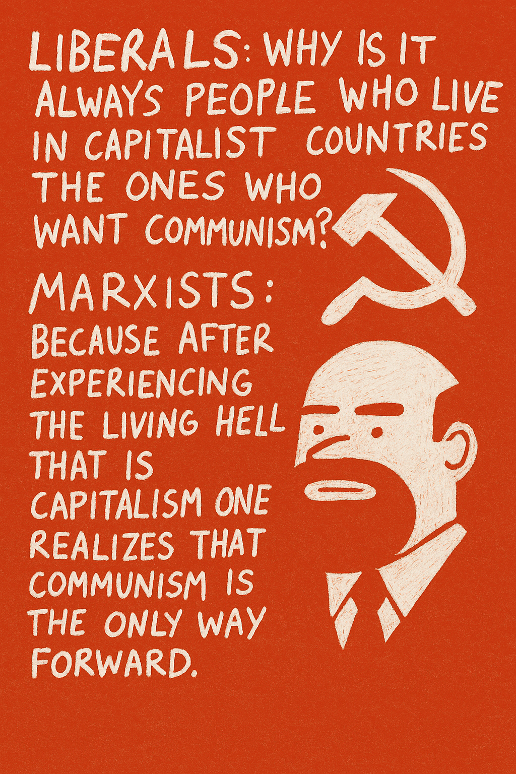 This meme seems… forced. (1) No one really asks that question, (2) the premise that only people in capitalist countries want communism is false, and (3) no Marxist worth their salt would answer this way.