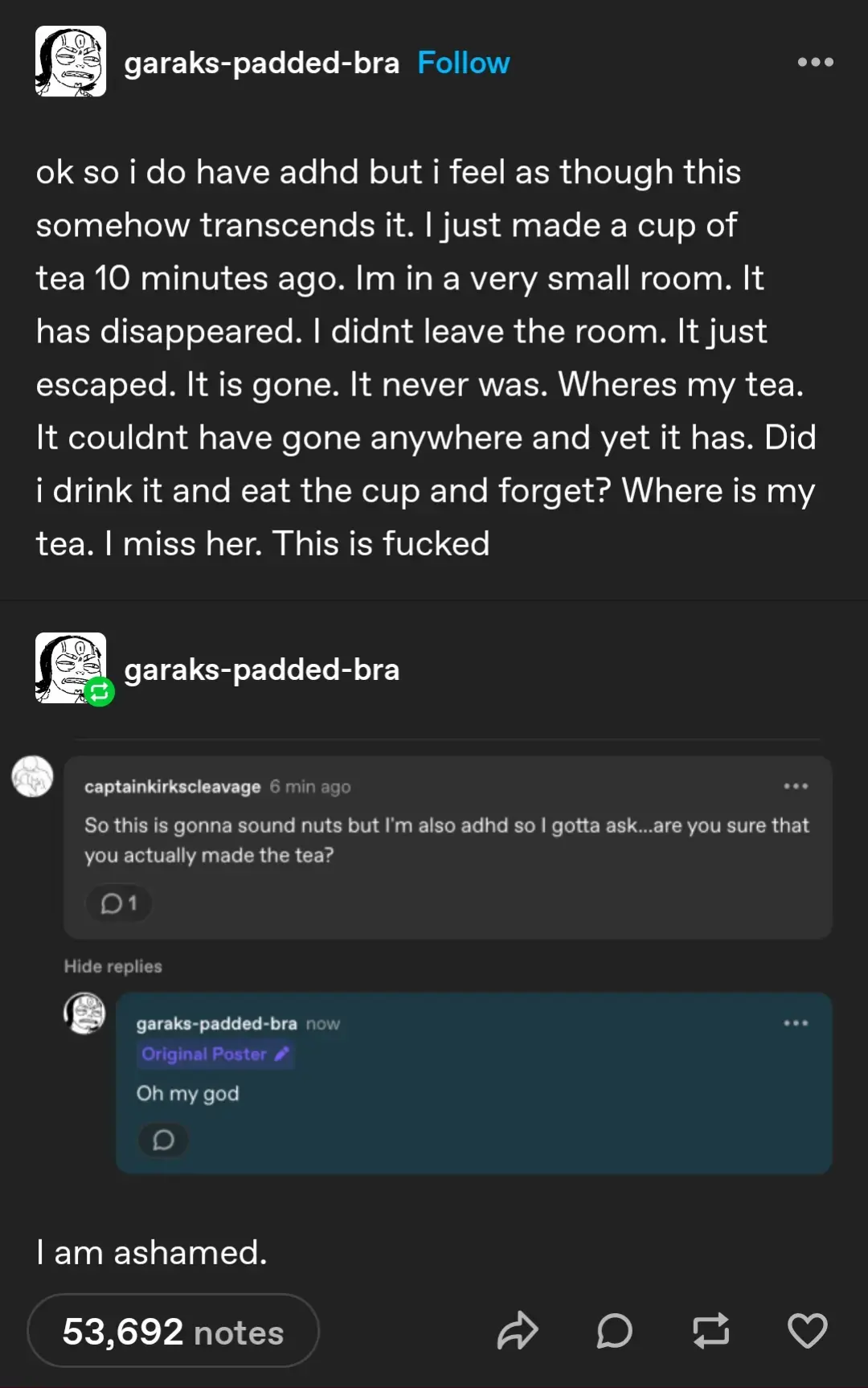 Stamets@lemmy.dbzer0.com to ADHD memes@lemmy.dbzer0.comEnglish · 24 days agoTea Timelemmy.dbzer0.comimagemessage-square28fedilinkarrow-up1559arrow-down15file-text