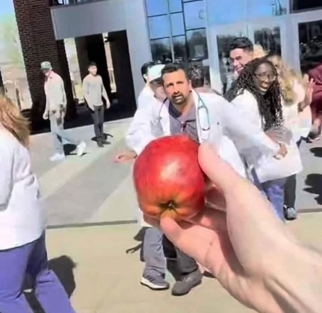 An apple in the hand is worth 4 doctors and 2 curious onlookers in a hospital?