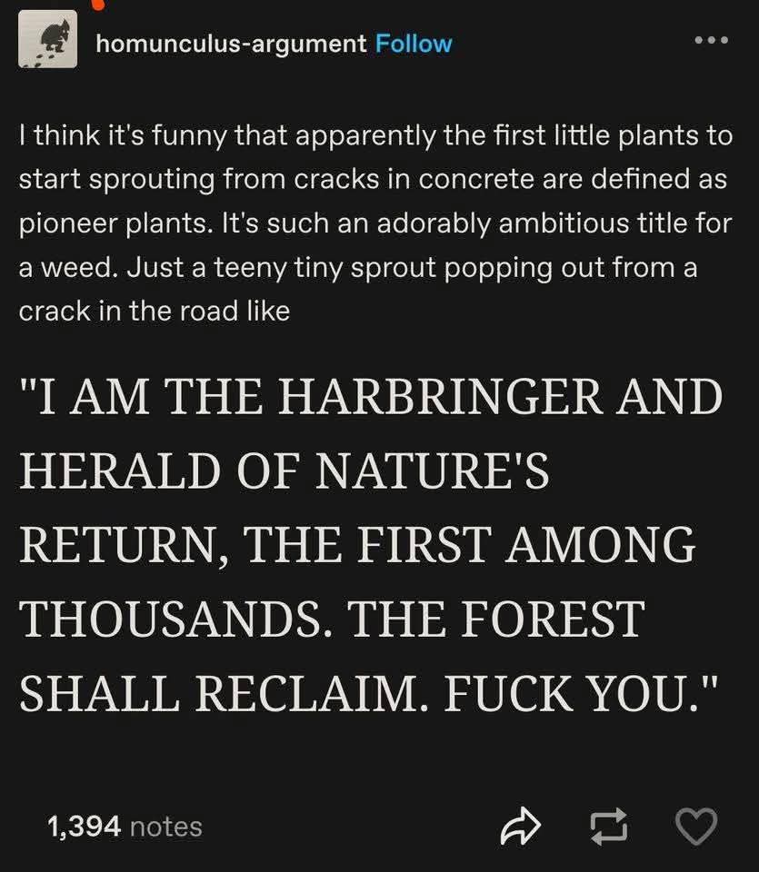 Track_Shovel@slrpnk.net to Science Memes@mander.xyzEnglish · edit-219 days agoPioneer speciesslrpnk.netimagemessage-square11fedilinkarrow-up1357arrow-down16file-text