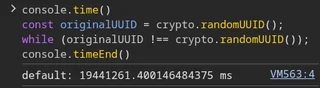 crypto - as in cryptography, not cryptocurrency - is just the library he’s using to generate the 128-bit random UUID. The snippet is interesting because he matched the original UUID in just over 5 hours. You’d expect to need more than 10^38 guesses to pick the same number again, which, even at 1 guess every microsecond, means something like 10^22 years.
