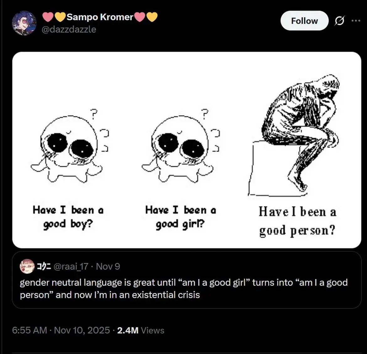 Twongo [she/her]@lemmy.ml to 196@lemmy.blahaj.zone · 1 month agoneutral language rulelemmy.mlimagemessage-square33fedilinkarrow-up1467arrow-down14