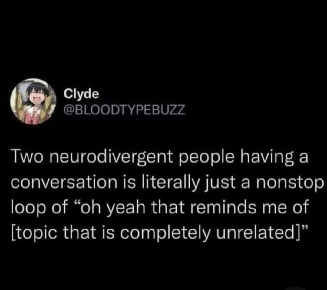I’m the ND that causes most of the branching, upon branching, upon branching but also usually the one to piece the conversation chain back together when we inevitably are both confused how we ended up at the current topic. Since I’m the one who caused the branching in the first place, it would be really difficult for the other person to piece it together.