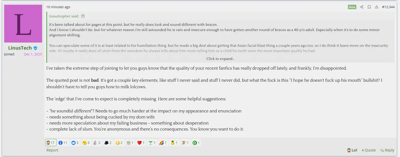 Hot off the heels of a colaboration with Linus Torvalds, we have tech youtube’s favorite butterfingers… telling kiwi farms to use more slurs