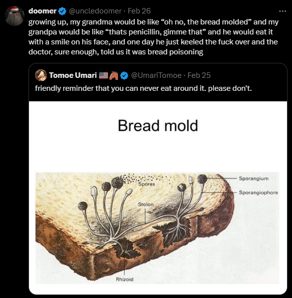 some people are fungus chasers and just want to rawdog bread to feel alive. who am I to judge that? you do you. just remember, when it feels like someone is twisting you inside out as you slowly lose consciousness, you chose this because you wanted that bread more than you wanted to live.