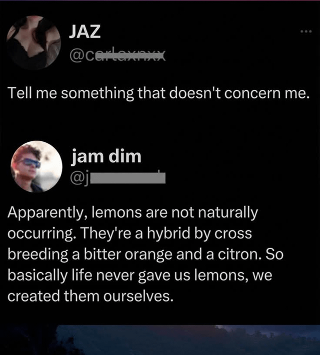 When life gives you lemons immediately take note as you may be stuck in a computer simulation, lemons are not naturally occuring and thus life has no lemons to give you, do not be fooled by the illusion your captors erected to keep you stuck in a computer simulation and harvest your brain waves for mining cryptocurrency.