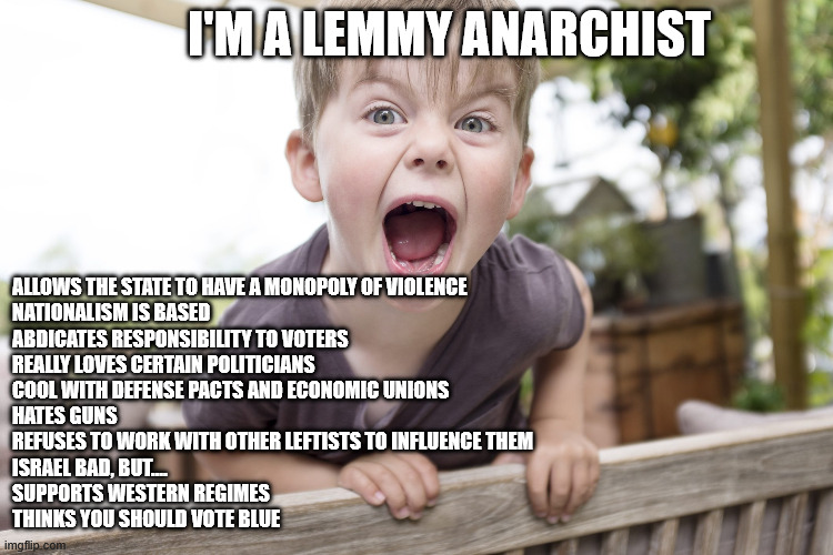 No, this isn’t infighting. The people I’m making fun of aren’t leftists. The point of the meme is to make fun of the fact a lot of the people on this service who call themselves Anarchists are not, they are liberals. This is why an Anarchist instance has a “Europe” community for example. I’ve been called a “Tankie” by “Anarchists” because I don’t believe in contracts, voting or nationalist leaders like Zelenskyy. These people don’t know what anarchists are and certainly haven’t read about anarchism.