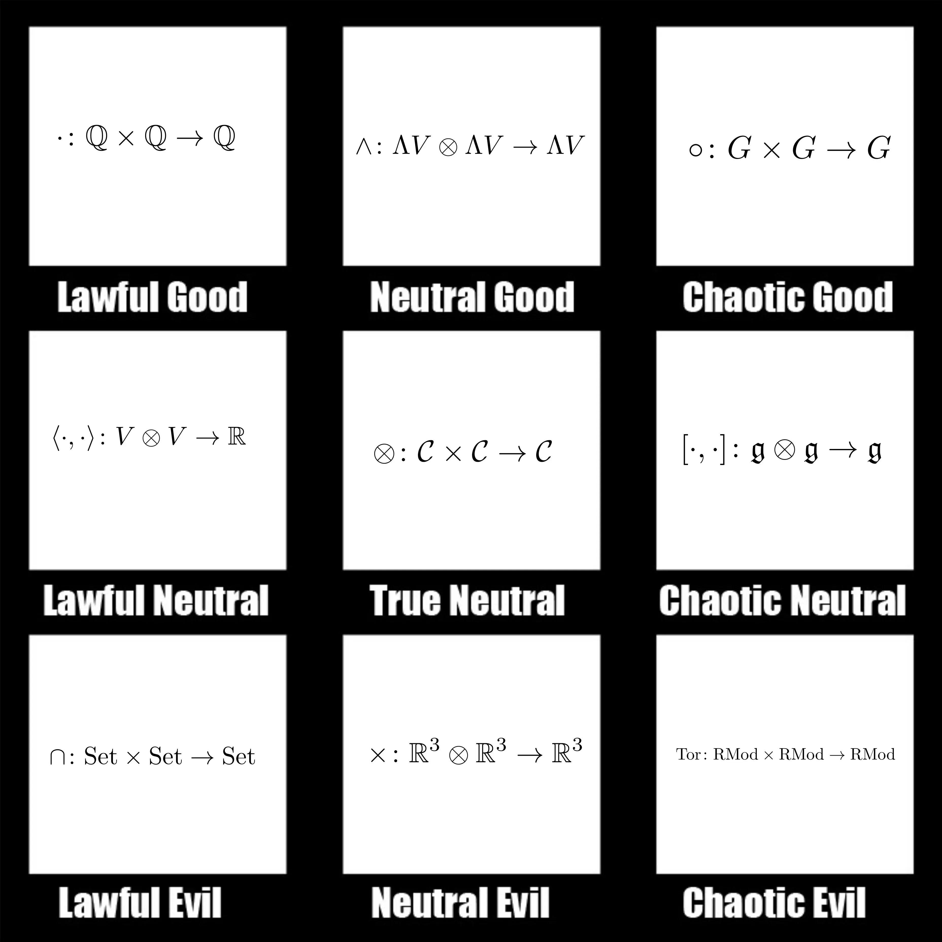 minus-squareEphera@lemmy.mllinkfedilinkEnglisharrow-up10arrow-down1·2 days ago Namely: lawful, true, chaotic, good, neutral and evil.