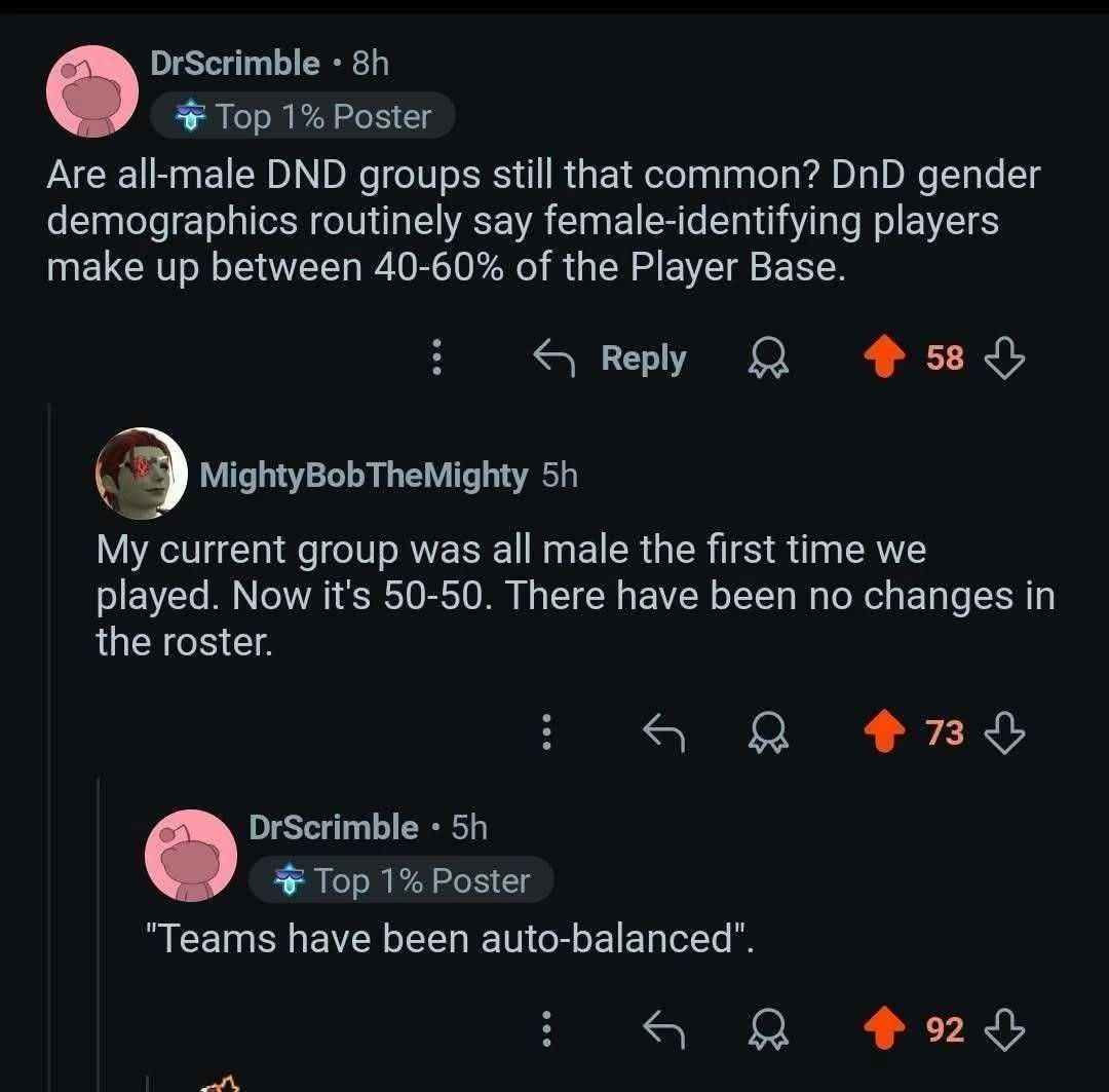 no one will be like “my DnD group was all men. it’s still all men no one transitioned”, even if it’s probably the most common experience lol